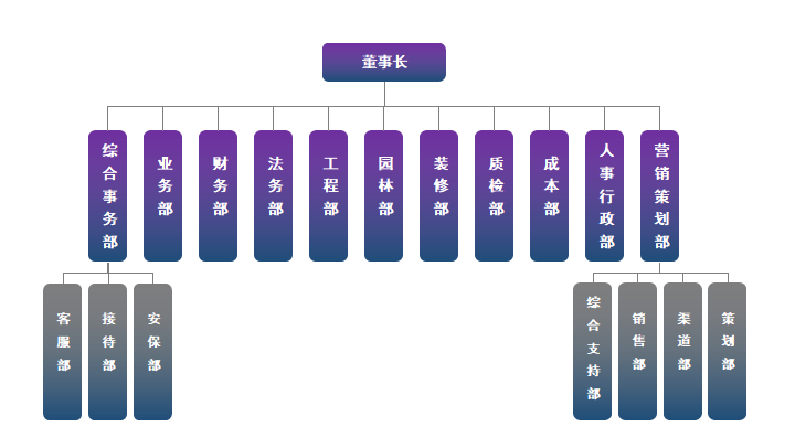 公司目前管理层近百人,其中90%具有大专及以上的学历,60%属于专业技术人员,公司经营所需的各类专业技术人才均具备。公司设有综合事务部、业务部、财务部、法务部、工程部、园林部、装修部、质检部、成本部、人事行政部、营销策划部。